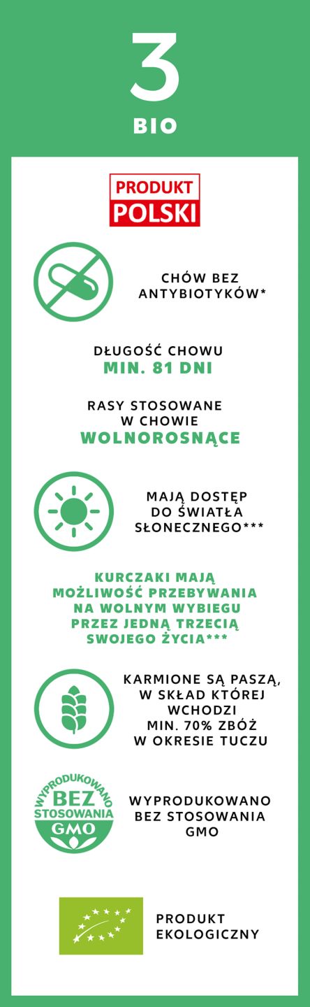***Zgodnie z Rozporządzeniem Parlamentu Europejskiego i Rady (UE) 2018/848 z dnia 30 maja 2018 r. w sprawie produkcji ekologicznej i znakowania produktów ekologicznych i uchylającym rozporządzenie Rady (WE) nr 834/2007 każdy drób bio musi spełniać ten wymóg.