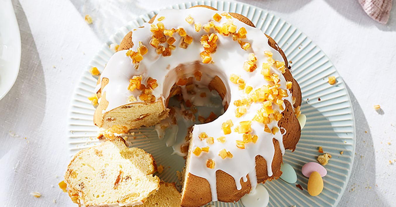 Rodzynki sparzyć i osączyć na sitku.Masło utrzeć z cukrem na puszystą masę za pomocą miksera. Stopniowo dodawać jajka i mleko, cały czas mieszając. Następnie, dalej mieszając, stopniowo dodawać oba rodzaje mąki przesiane i wymieszane z proszkiem do pieczenia oraz skórkę i sok z cytryny. Do ciasta wsypać rodzynki, delikatnie wymieszać, by się równomiernie rozłożyły (można wymieszać mikserem na wolnych obrotach). Piekarnik rozgrzać do temp. 170°C. Formę do babki posmarować tłuszczem i posypać bułką tartą. Wlać ciasto, wyrównać powierzchnię. Piec 45–50 minut. Upieczoną babkę wyjąć z formy i ostudzić. Przygotować lukier wg przepisu na opakowaniu i polać ciasto. Na koniec babkę posypać kandyzowaną skórką pomarańczową.