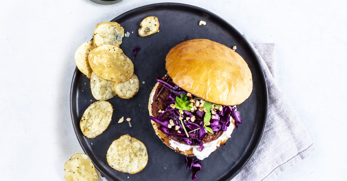 Beyond Burger z czerwoną kapustą, orzechami i chipsami