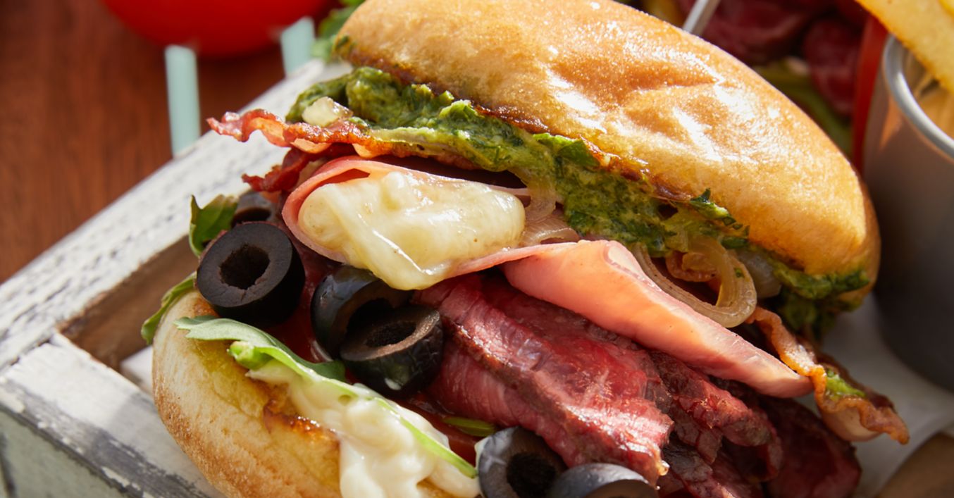 Mięso wyjąć z piekarnika, na krótko odłożyć i pokroić w plastry. Dolne połówki bułek posmarować majonezem, obłożyć sałatą, oliwkami, pomidorem, mięsem, sosem chimichuri, boczkiem i szynką z serem. Przykryć górnymi połówkami, można spąć patyczkami do szaszłyków. Burgery dobrze smakują z frytkami.