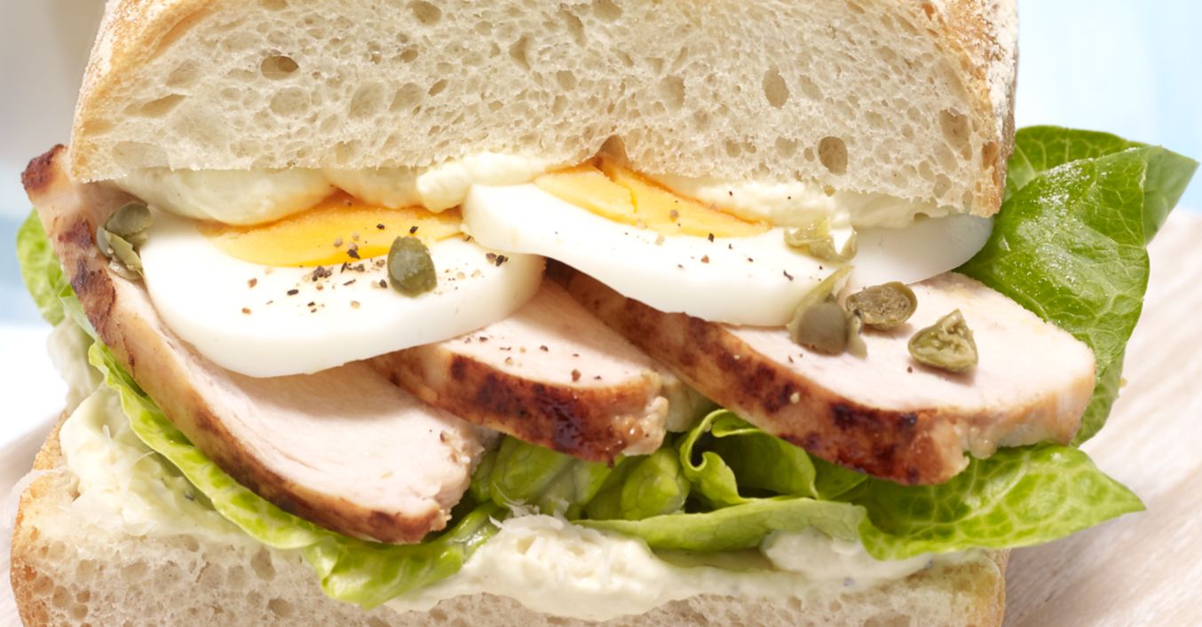 Ciabatta zapiec zgodnie ze wskazówkami na opakowaniu w nagrzanym piekarniku, podzielić na 4 części i każdą przepołowić wszerz. Polówkę dolną i górną posmarować kremem twarożkowym. Sałatę umyć, oczyścić i podzielić na części. Jajka obrać i pokroić na plasterki. Pierś z kurczaka pokroić na cienkie plasterki. Na dolną część ciabatty nakładać sałatę, kurczaka oraz jajko, posypać kaparami. Nałożyć górną część ciabatty i podawać.
