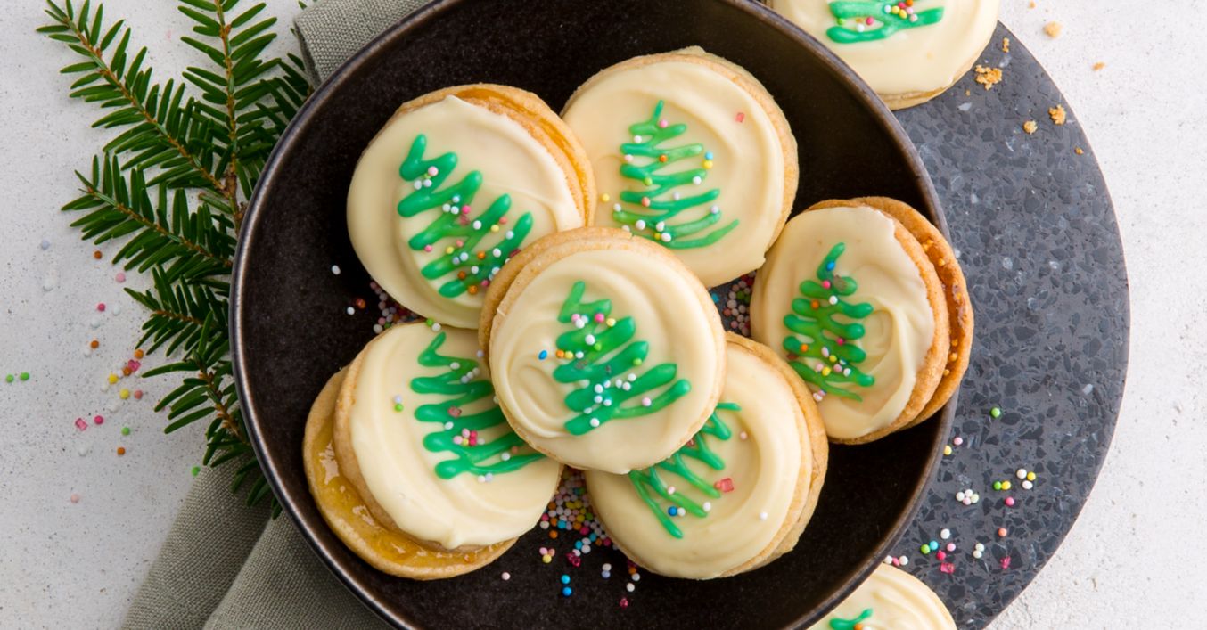 Pozostały cukier puder wymieszać z 1 łyżką wody, aż do uzyskania gładkiej konsystencji, zabarwić zielonym barwnikiem spożywczym i wyciskać go na ciasteczka, malując na nich małe choinki. Wedle uznania ciasteczka można dodatkowo udekorować kolorowymi perełkami cukrowymi.