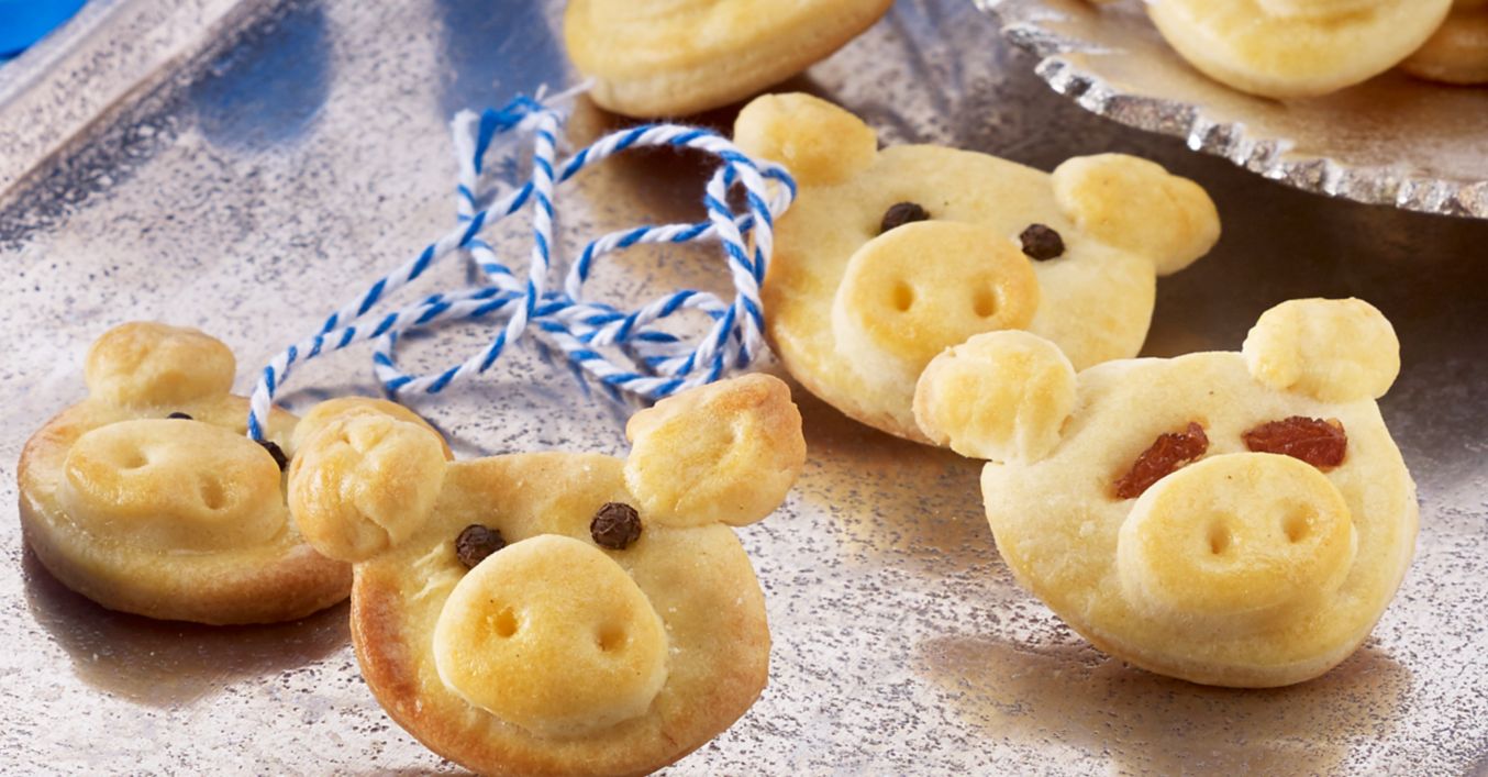 Drugie jajko roztrzepać, posmarować nim większe kółka i ułożyć na blasze wyłożonej papierem. Mniejsze kółko położyć poniżej połowy większego kółka (nosek świnki) i, za pomocą patyka do szaszłyków, zrobić w nim dwie dziurki. Z kulek uformować uszy i położyć, dobrze przyciskając, na górną część większych kółek. Uszy i nos również posmarować jajkiem. W zależności od wybranej wersji ułożyć rodzynki (jeśli są za duże, można je przekroić na pół) lub pieprz i zrobić oczka świnki. Piec w temp. 180°C (termoobieg: 160°C) przez ok. 12–15 minut. Gotowe ciastka ostudzić na kratce kuchennej.