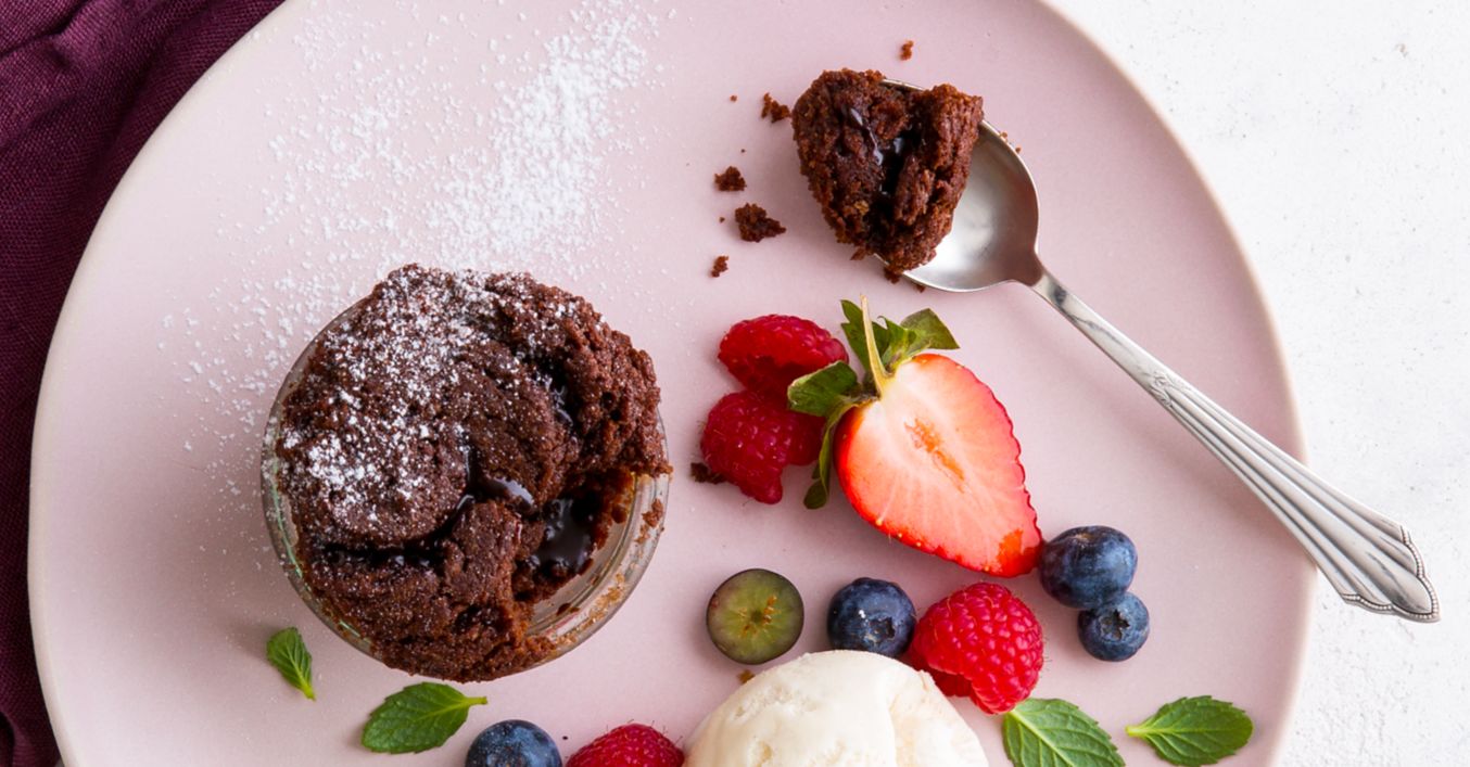 Ciasto czekoladowe piec na środkowym poziomie piekarnika w temp. 180°C, (z termoobiegiem 160°C) przez ok. 16-18 minut, a następnie – lekko przestudzone – podawać w słoiczkach z lodami waniliowymi i jagodami.