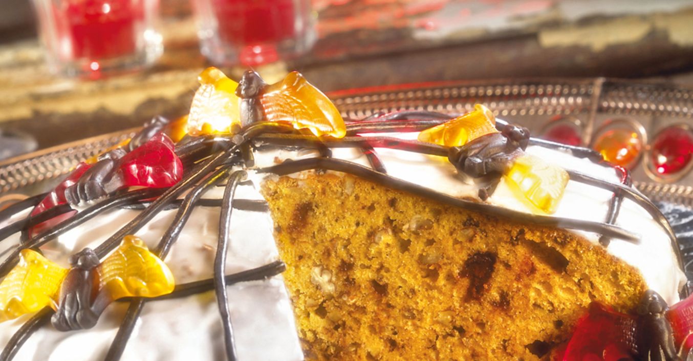 Upieczone ciasto odstawić, aby dobrze wystygło. W celu przygotowania glazury wymieszać cukier puder z mlekiem i polać ciasto. Żelkowe ślimaki rozwinąć i utworzyć na cieście wzór przypominający pajęczynę. Następnie ciasto udekorować nietoperzami i podawać.