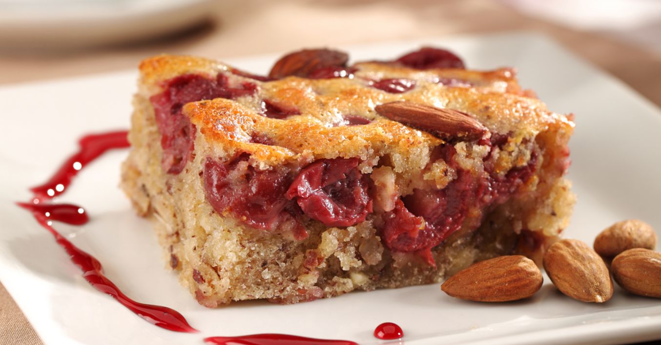 Głęboką formę wyłożyć papierem do pieczenia. Wlać ciasto, delikatnie wyrównując powierzchnię. Na wierzch położyć wiśnie i migdały. Włożyć do piekarnika o temp. 200°C i piec ok. 30 minut.
