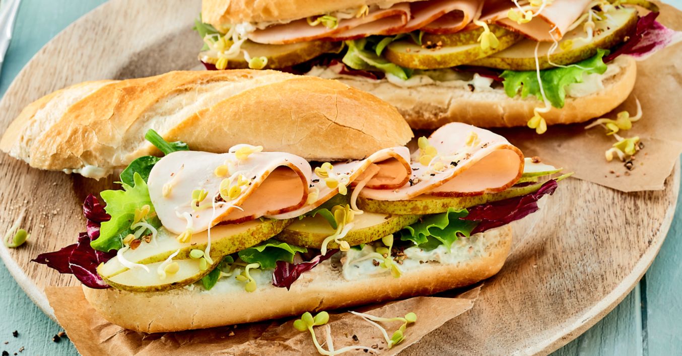 Bagietki przekroić. Spodnie części posmarować kremem śmietanowo-serowym, na wierzchu rozłożyć sałaty i gruszki.