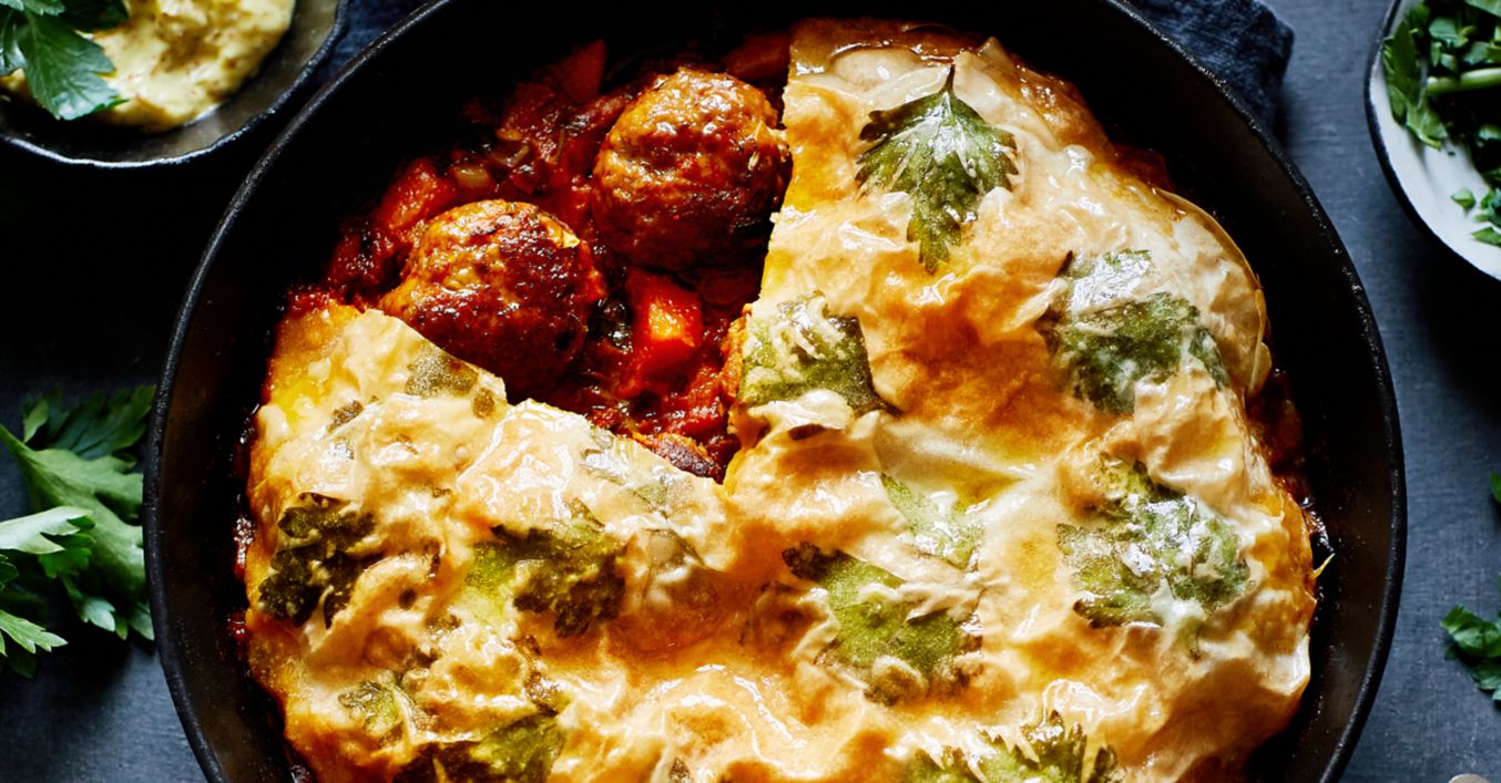 Masło rozpuścić w garnku i posmarować nim z wierzchu ostatni placek. Patelnię przełożyć do piekarnika nagrzanego do 180°C. Piec z funkcją termoobiegu przez 20–25 minut.