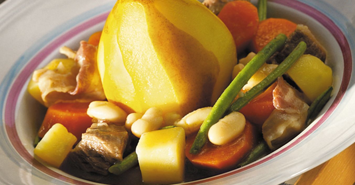 Marchewki umyć, obrać, pokroić w plastry. Seler umyć, obrać i pokroić w kostkę. Ziemniaki obrać, umyć i pokroić w kostkę. Zieloną fasolkę umyć. Gruszki umyć, obrać, zostawiając kilka pasków skórki na owocach. Tak przygotowane składniki dodać do garnka z mięsem.