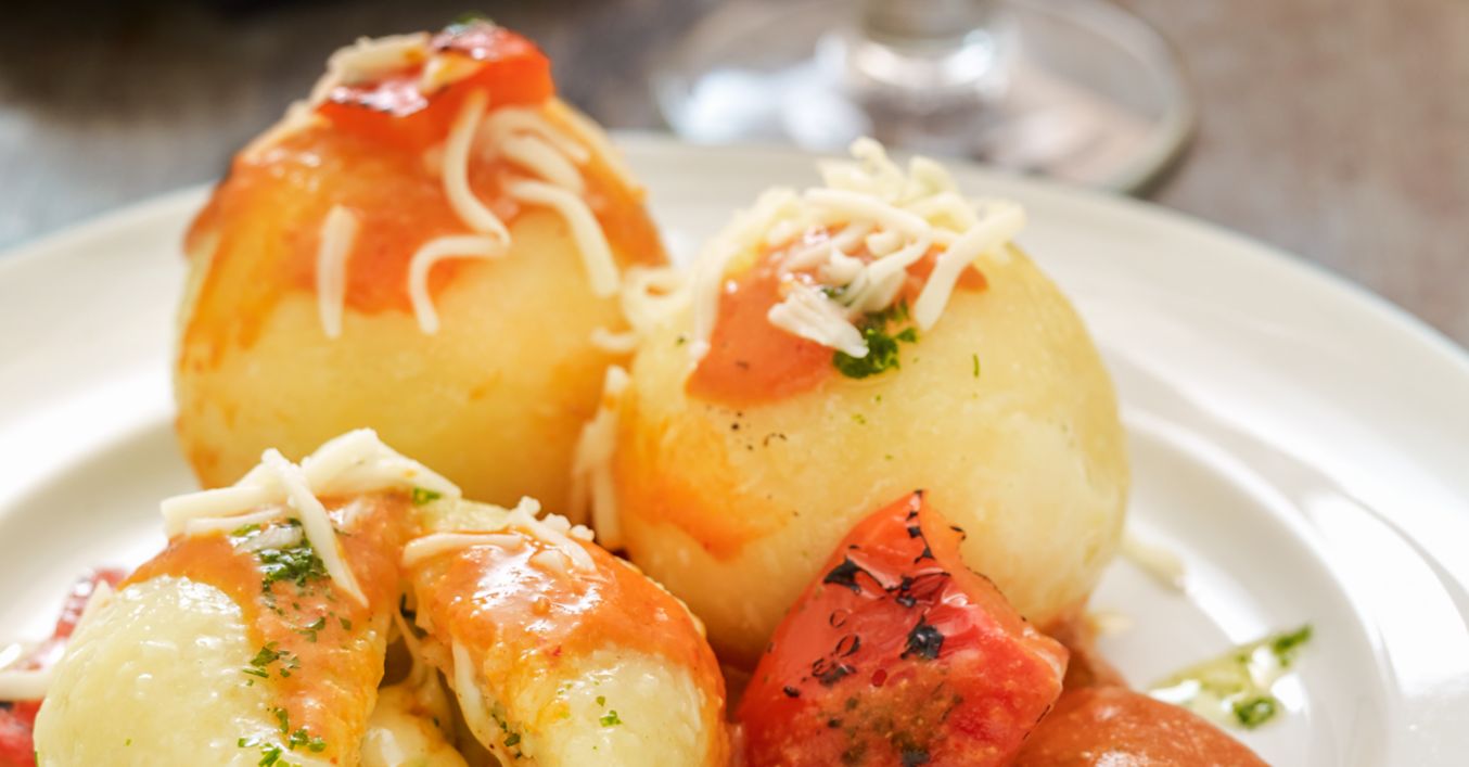 Kluski, skropione oliwą ziołową i posypane serem mozzarella, podawać z sosem.