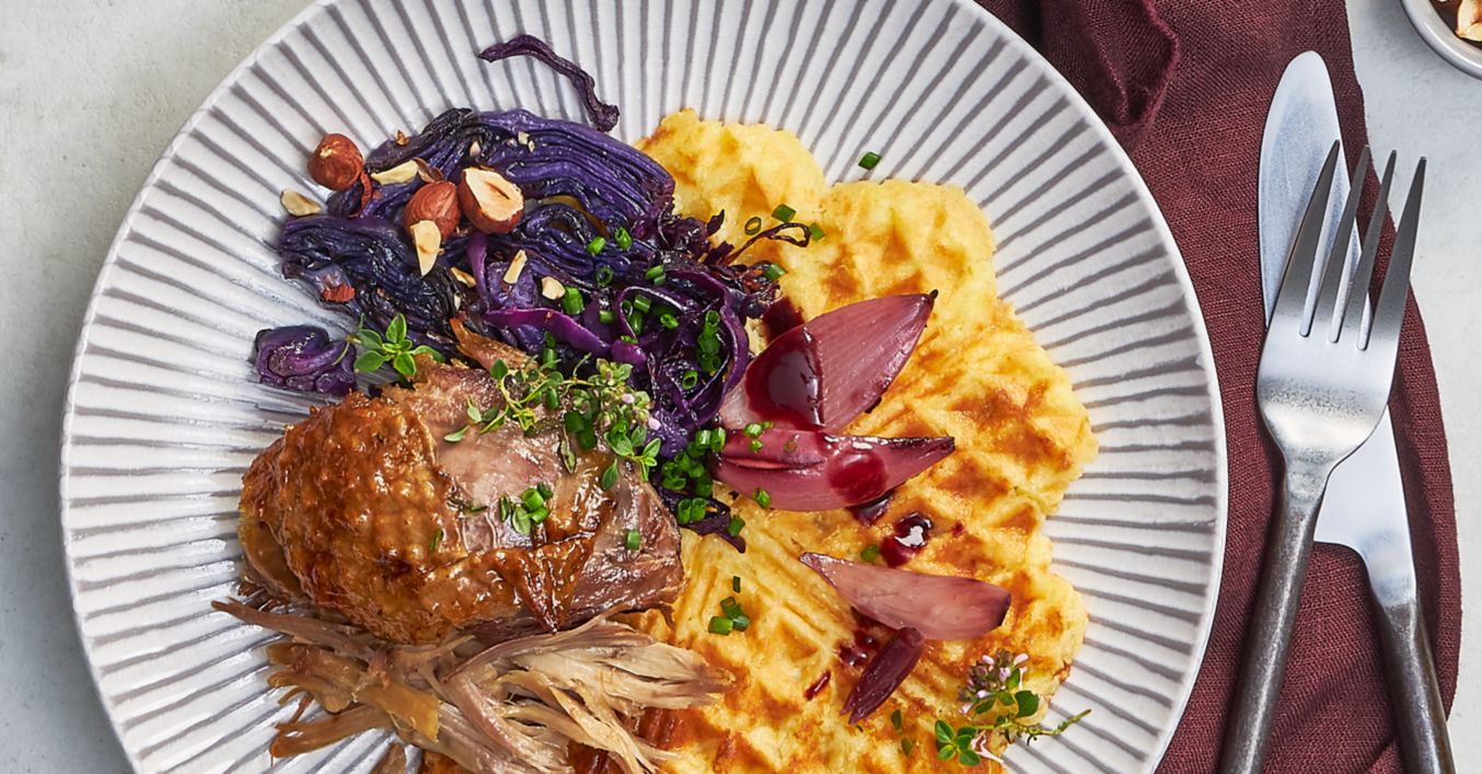 <bulletlist><bullet>Zioła umyć i osuszyć. Oberwać listki tymianku, łodyżki odłożyć, a szczypiorek pokroić w cienkie krążki.</bullet><bullet>Knedle pokroić na kawałki, rozgnieść widelcem, dodać mleko, jajka i tymianek i zagnieść gładkie ciasto, a następnie doprawić solą.</bullet><bullet>Szalotki obrać i przepołowić, doprawić solą i przez około 2 minuty lekko smażyć na 1 łyżeczce roztopionego masła. Dodać cukier i stale mieszając, lekko skarmelizować. Łodyżki tymianku wraz z cynamonem przełożyć do garnka, podlać 100 ml soku z winogron oraz 50 ml bulionu i pod przykryciem gotować na wolnym ogniu przez 15 minut. Usunąć łodyżki ziół i cynamon, a szalotki w czerwonym sosie zagęścić zagęstnikiem do sosów.</bullet><bullet>Czerwoną kapustę umyć, osuszyć, usunąć głąb, liście pokroić w cienkie paski i smażyć na patelni na rozgrzanym oleju z orzechami laskowymi przez 2–3 minuty. Podlać resztą soku i bulionu, całość zredukować na średnim ogniu, dodać połowę szczypiorku i resztę masła, a następnie doprawić solą i pieprzem.</bullet><bullet>Rozgrzać gofrownicę, w razie potrzeby natłuścić. Ciasto nakładać 2 łyżkami do gofrownicy i piec jeden po drugim dwa złotobrązowe gofry. Gęsinę poszarpać na kawałki, podgrzać z szalotką w czerwonym sosie i podawać posypaną pozostałym szczypiorkiem z zasmażaną czerwoną kapustą i goframi.</bullet></bulletlist>