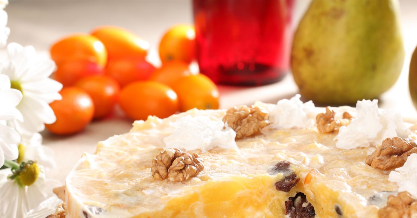 Przed podaniem wyjąć na talerz. Wierzch udekorować bitą śmietaną, orzechami i owocami kandyzowanymi.