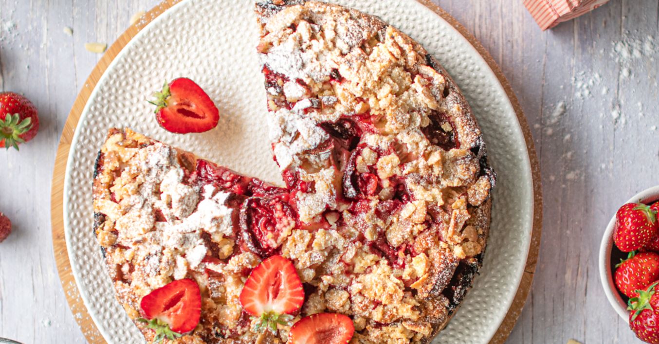 Jogurtowe ciasto z truskawkami, rabarbarem i kruszonką