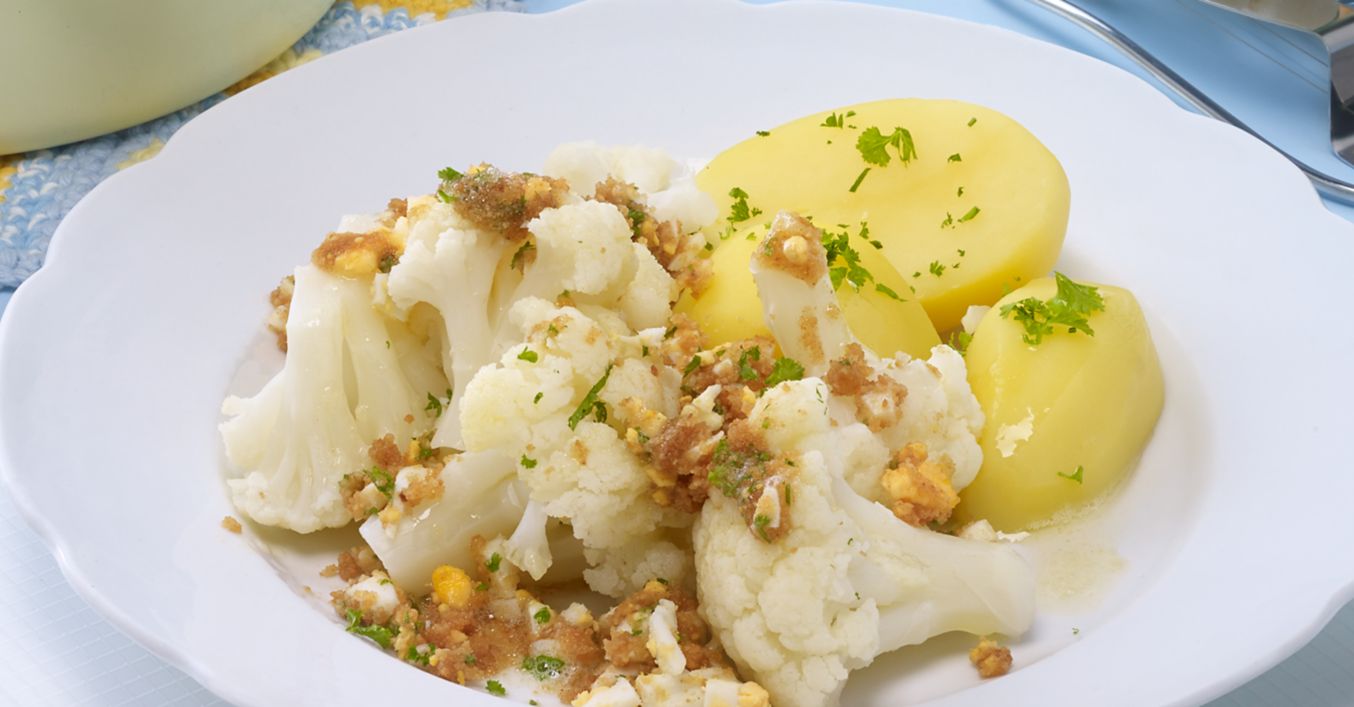 Kalafior podzielić na duże różyczki, umyć i gotować w osolonym wrzątku 10-15 minut. Jajka ugotować na twardo (8-9 minut), obrać i pokroić w kostkę. Masło rozgrzać, dodać bułkę tartą i podsmażyć. Dodać pokrojone jajka i pietruszkę, doprawić solą, pieprzem i gałką muszkatołową. Odsączone różyczki kalafiora ułożyć na talerzach, na wierzch wyłożyć mieszankę bułki z jakami i pietruszką. Podawać z ziemniakami.
