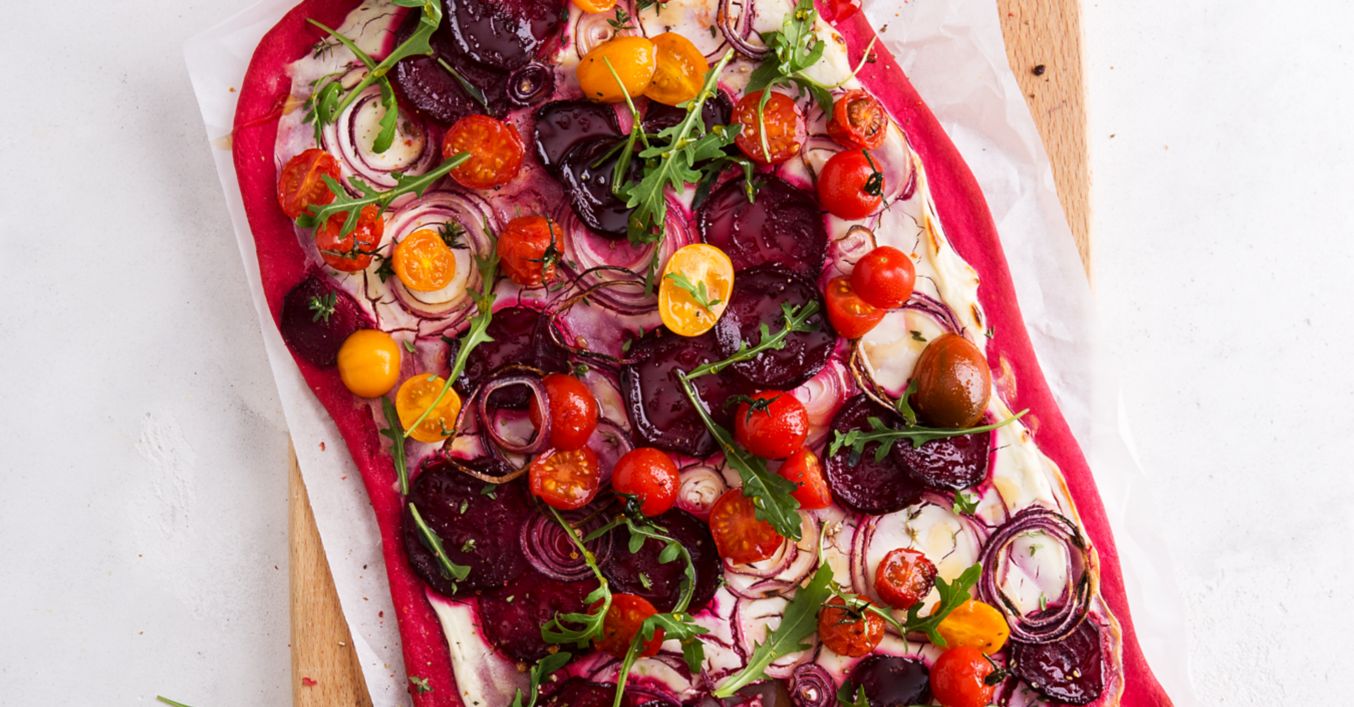 Rozwałkowane placki posmarować twarożkiem, nałożyć cebulę, plastry buraczków i pomidorki. Piec w piekarniku nagrzanym do 250°C (z termoobiegiem 230°C) przez 7–8 minut na blasze wyłożonej papierem do pieczenia.