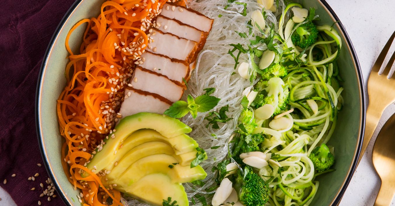 Zioła umyć, osuszyć i posiekać. Marchewki obrać. Cukinię umyć. Warzywa pokroić na „spaghetti” za pomocą spiralnej obieraczki do warzyw. Brokuł umyć i podzielić na małe różyczki.