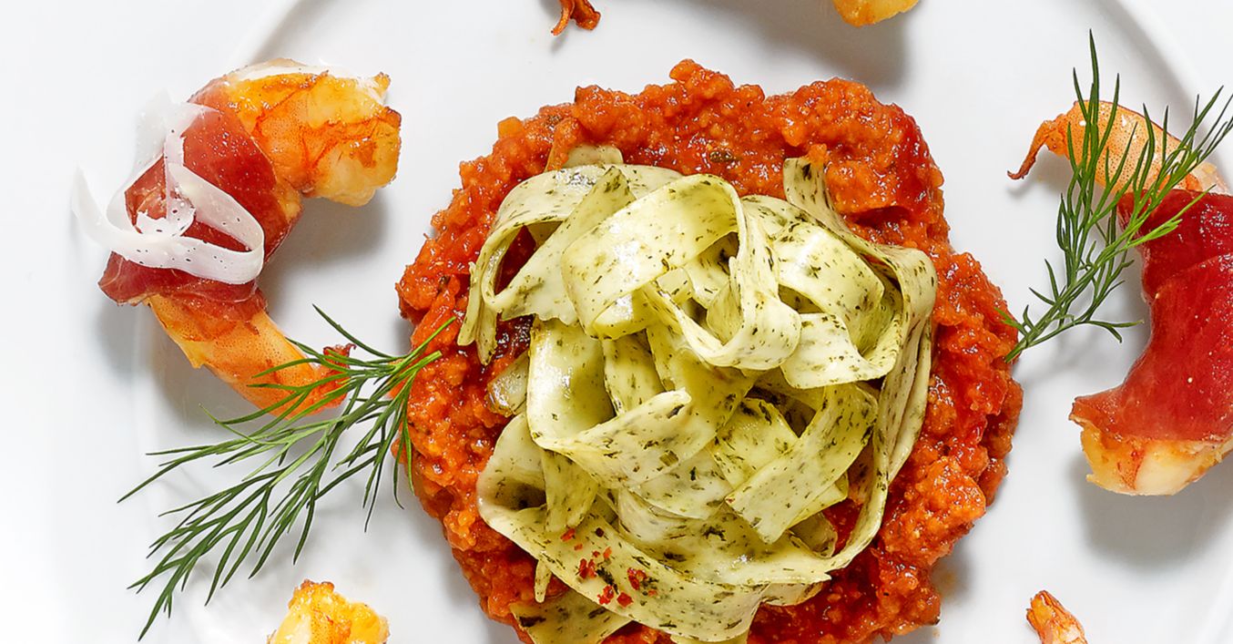 Krewetki z makaronem i chrupiącą szynką Serrano