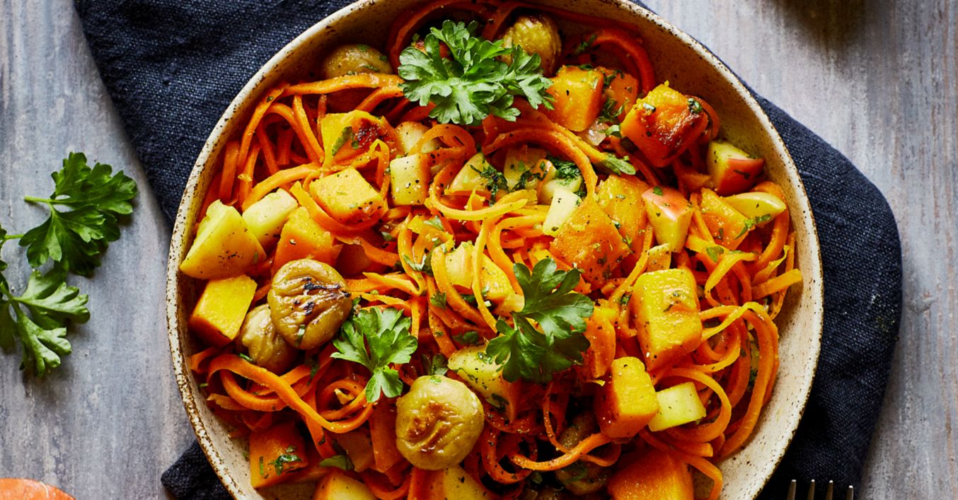Dynię umyć i obrać. Odkroić jej wąską część i za pomocą skrobaczki, spiralizera lub nożem wyciąć makaron dyniowy. Szeroką część przekroić, usunąć pestki, a miąższ pokroić w drobną kostkę.