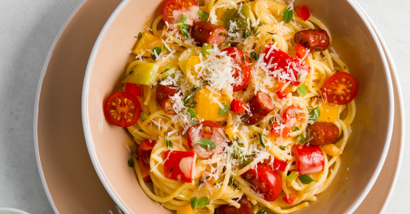 W garnku umieścić makaron spaghetti, paprykę, kabanosy, pomidory, śmietanę oraz 400 mililitrów wody. Zagotować, a następnie gotować pod przykryciem przez około 10 minut, co jakiś czas mieszając. Podawać z parmezanem i świeżymi ziołami.