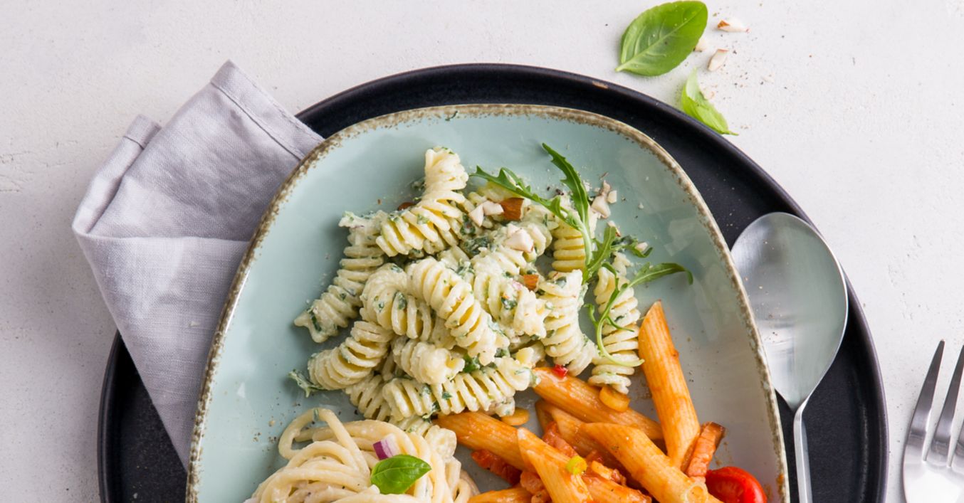 Sos do fusilli: Resztę bazylii, rukolę, parmezan i migdały drobno zmiksować. Następnie przełożyć do miski i wymieszać z jogurtem. Doprawić sokiem z cytryny, solą i pieprzem.