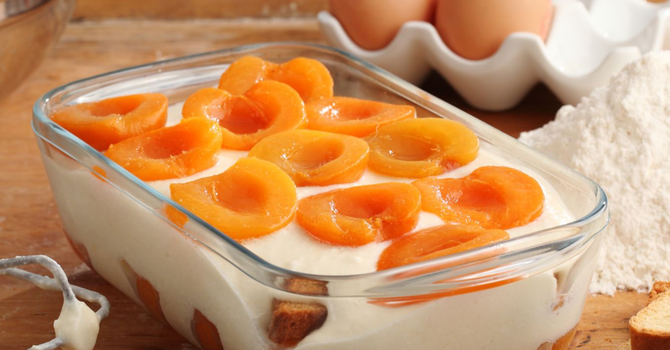 Naczynie do zapiekania napełniać na przemian plasterkami owoców, kremem i sucharkami. Na górę położyć krem, udekorować kilkoma plasterkami moreli. Orzechy zemleć lub posiekać i posypać deser.