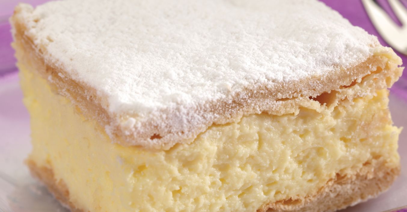 Następnie gotować krem na wolnym ogniu, nie przerywając mieszania, aż zgęstnieje. Na jeden prostokąt ciasta wylać gorący krem, wyrównać powierzchnię i ostrożnie przykryć drugim blatem ciasta. Lekko docisnąć i odstawić, aby krem zastygł. Gdy krem zastygnie, pociąć nożyczkami górny blat na kwadraty o boku około 5 cm.