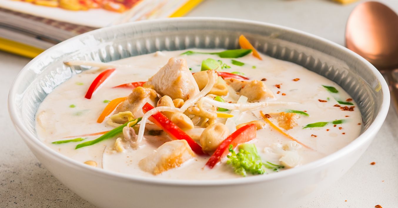Masło orzechowe wymieszać z małą ilością ciepłego bulionu, dodać do potrawy razem z imbirem, kolendrą i chili.
