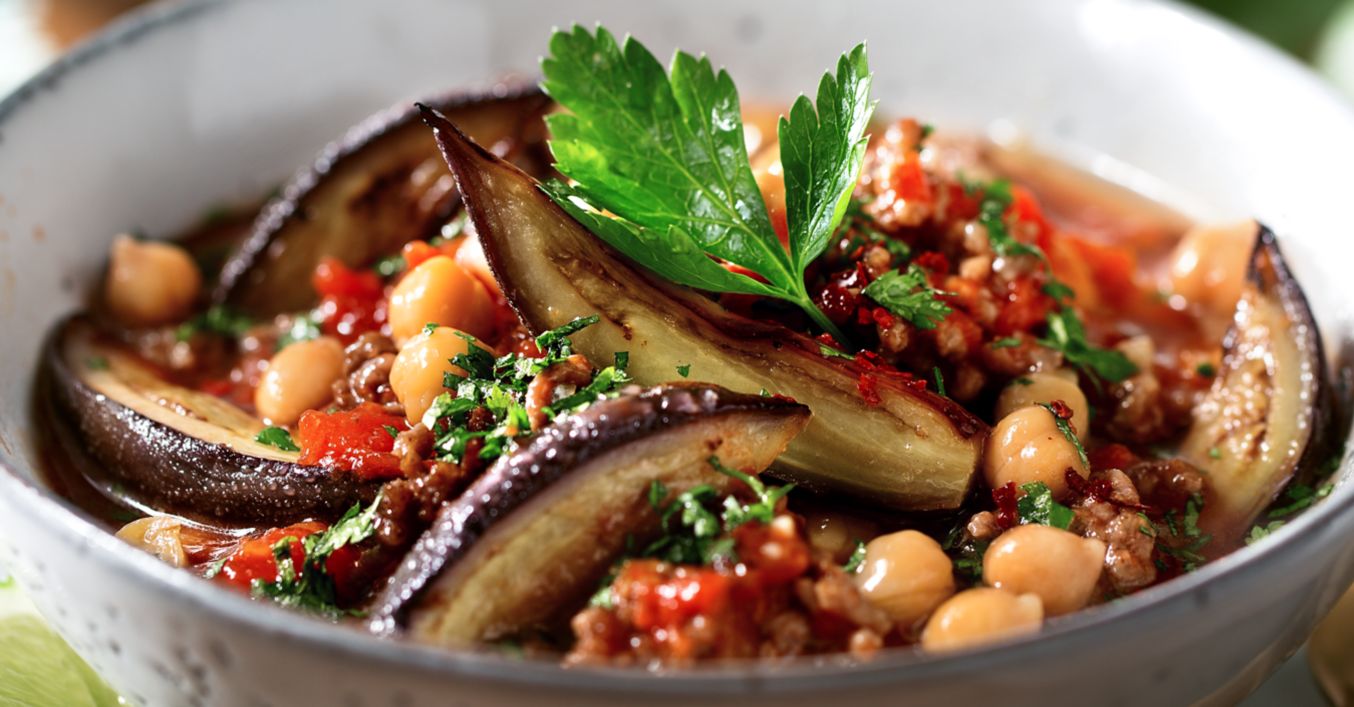 Na rozgrzanym oleju podsmażyć mięso. Dodać kmin, pieprz cayenne, łyżeczkę soli, cebule i czosnek, dusić całość przez ok. 3 minuty. Wlać bulion, dodać pomidory i bakłażan, gotować na średnim ogniu ok. 15 minut. Na chwilę przed końcem tego czasu dodać osączoną soczewicę.