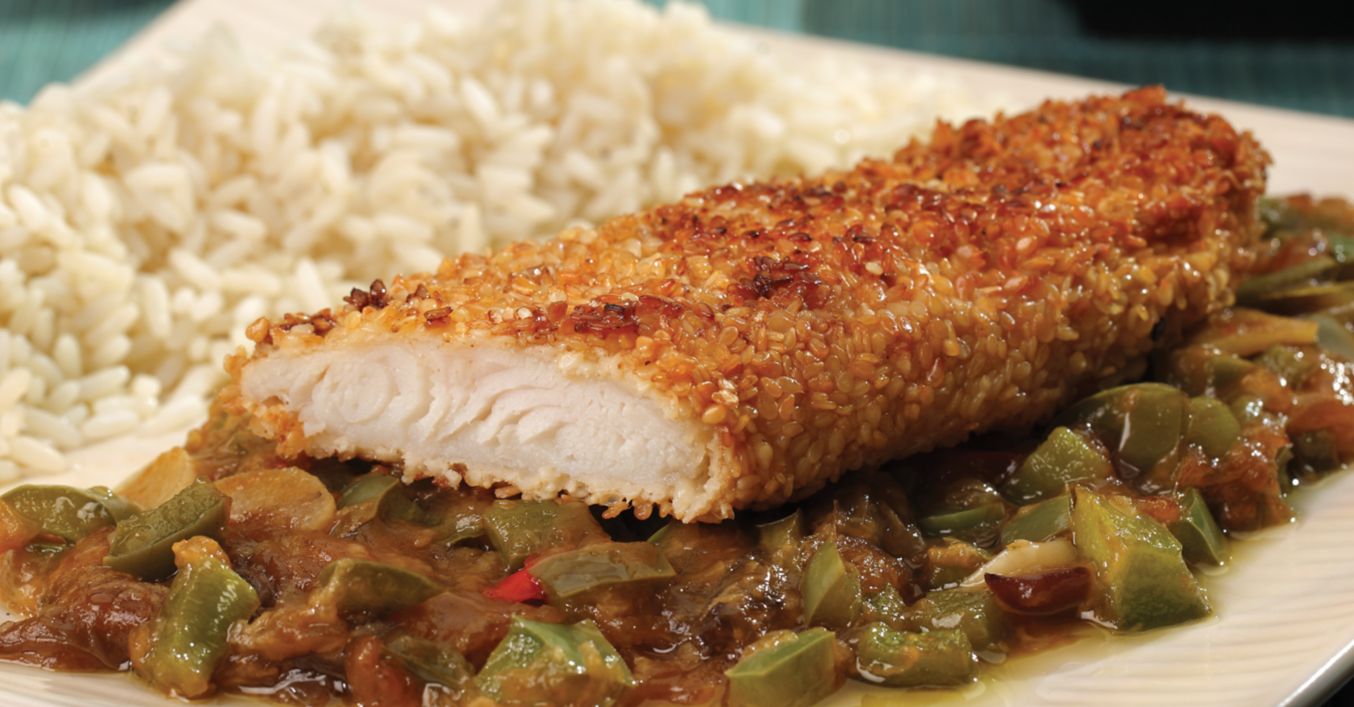 Filety rybne opłukać, osuszyć, pokroić na kawałki o boku około 3-4 cm, oprószyć ze wszystkich stron solą. Jajka roztrzepać ze sporą szczyptą chińskiej przyprawy "5 smaków". Kawałki ryby posypać mąką pszenną, zanurzyć w jajkach i obtoczyć w sezamie.