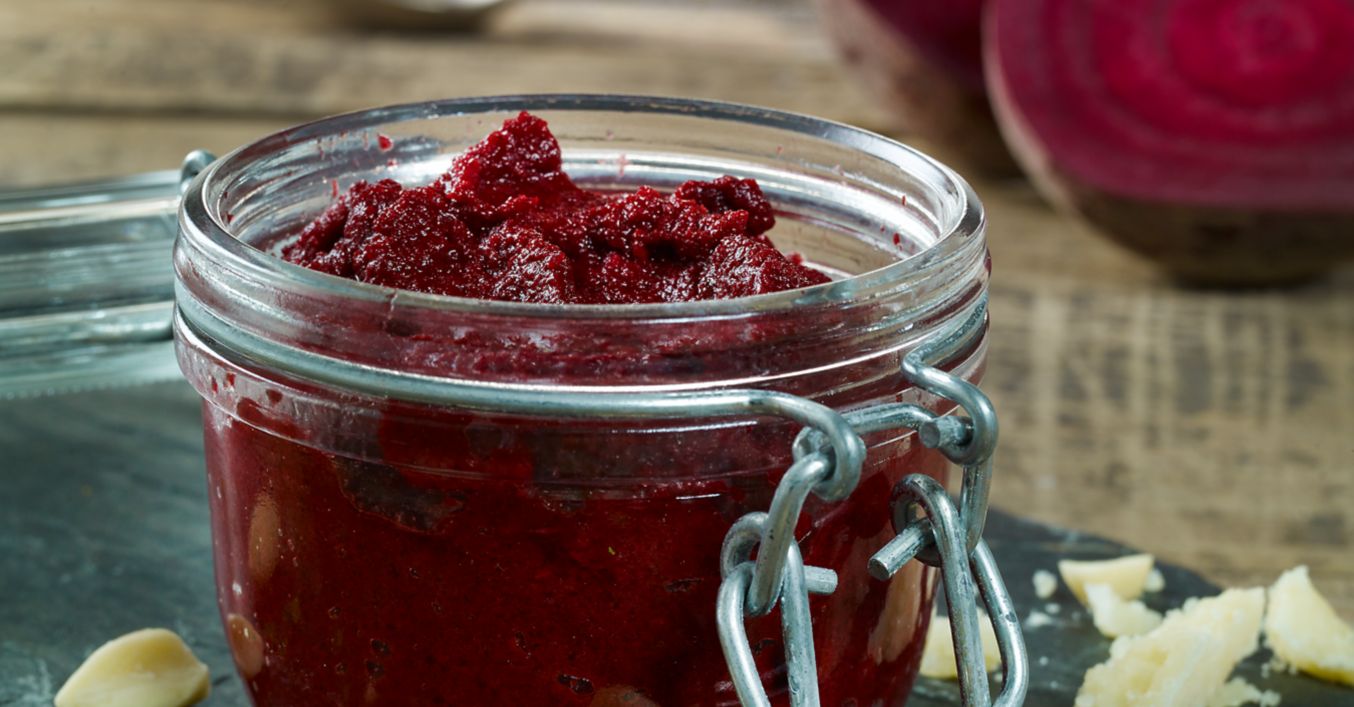 Buraki zmiksować z migdałami, oboma olejami i parmezanem. Dodać majeranek i wymieszać.