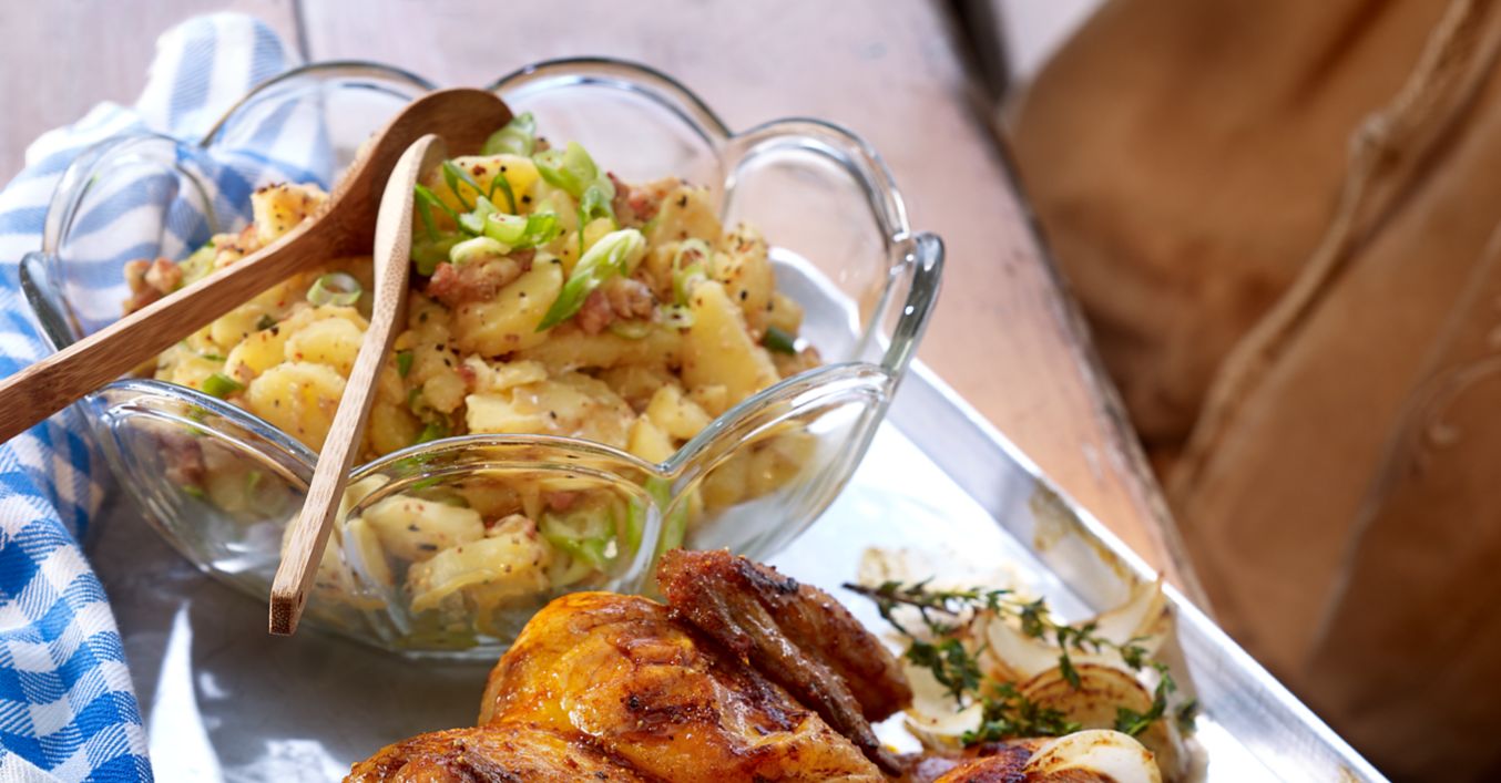 Uda lub podudzia z kurczaka umyć i osuszyć. Olej wymieszać z musztardą, koncentratem, solą i pieprzem. Marynatą dokładnie posmarować kawałki kurczaka. Mięso ułożyć w naczyniu żaroodpornym, piec w piekarniku rozgrzanym do temp. 180 C przez ok. 50-60 minut. Cebule obrać i pokroić na ćwiartki. Zioła opłukać. Cebulę i zioła dodać do pieczonego kurczaka na 30 minut przed końcem pieczenia. Kurczaka można podać z ziemniakami i mizerią lub z sałatką ziemniaczaną.