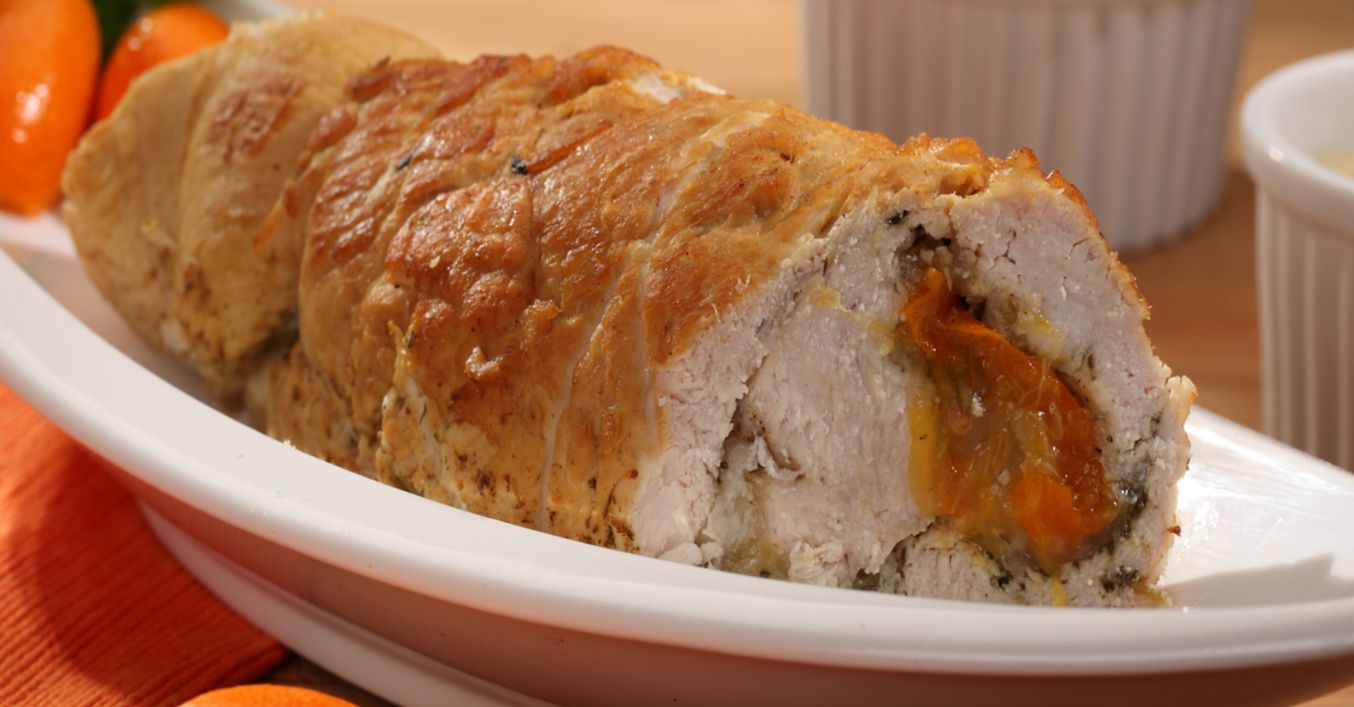 Mięso ciasno zwiń, obwiąż nicią kuchenną i obsmaż na rozgrzanej oliwie. Przełóż do rondla, podlej szklanką wody z rozpuszczoną kostką bulionową, posmaruj miodem. Dodaj paseczki skórki. Duś pod przykryciem na wolnym ogniu 50 minut, aż mięso będzie miękkie.