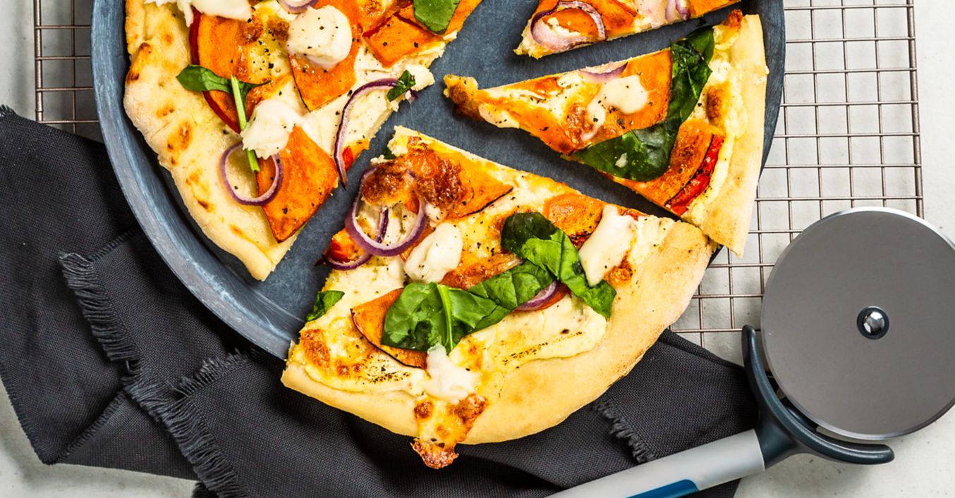 Pizza bianca z dynią, szpinakiem i mozzarellą