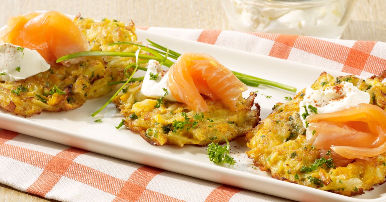 Rozgrzać olej i usmażyć placki na kolor złotobrązowy. Podawać z kwaśną śmietaną i łososiem.