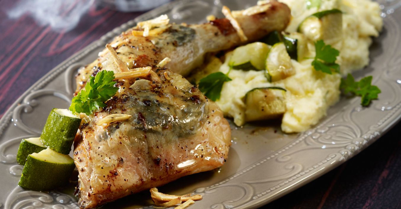 Udka kurczaka umyć i osuszyć. Czosnek obrać, pokroić w słupki, wraz z ziołami wsunąć pod skórę udek. Udka przyprawić solą i pieprzem, umieścić na blasze do pieczenia i piec w rozgrzanym piekarniku w temperaturze 200°C (piekarnik gazowy: stopień 4, termoobieg 180°C) przez ok. 50-60 min na kolor złotobrązowy.