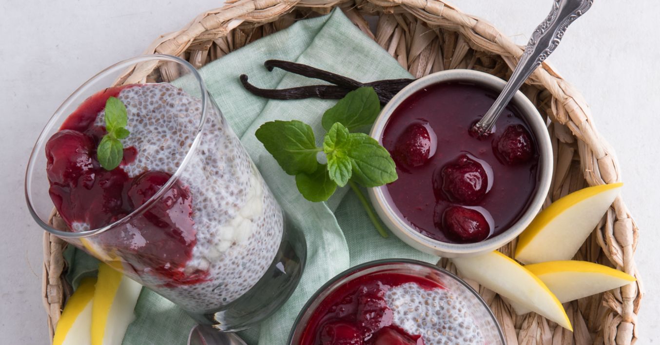 Miąższ melona zmiksować, wymieszać z mlekiem, sokiem z agawy i nasionami chia, następnie poczekać, aż chia napęcznieją przez ok. 30 min, często mieszając. Pudding przelać do pucharków deserowych i włożyć do lodówki na ok. 2 godz. Wiśnie rozmrozić, grubo zmiksować i wymieszać z sokiem. Laskę wanilii przekroić wzdłuż na pół i wydobyć ziarenka za pomocą ostrego noża. Cukier skarmelizować na kolor złotobrązowy, następnie zalać go wiśniowym puree, dodać ziarenka wanilii i gotować na wolnym ogniu przez ok. 5 min, cały czas mieszając. Pudding chia polać sosem wiśniowym i podawać.