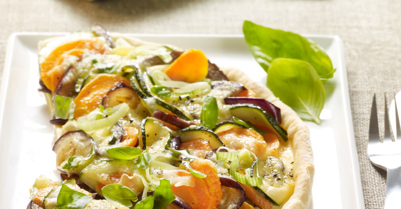 Ciasto rozwałkować, wyłożyć, tworząc brzeg, na natłuszczoną formę do quiche. Na wierzchu ułożyć warzywa. Bazylię umyć, osuszyć, posiekać. Śmietanę, biały ser, jajka i mąkę wymieszać, doprawić solą, pieprzem i gałką muszkatołową, dodać bazylię. Powstały sos wylać do formy, z wierzchu obsypać serem. Piec w piekarniku nagrzanym do 180ºC (z termoobiegiem: 160ºC) ok. 50 minut na kolor złotobrązowy.