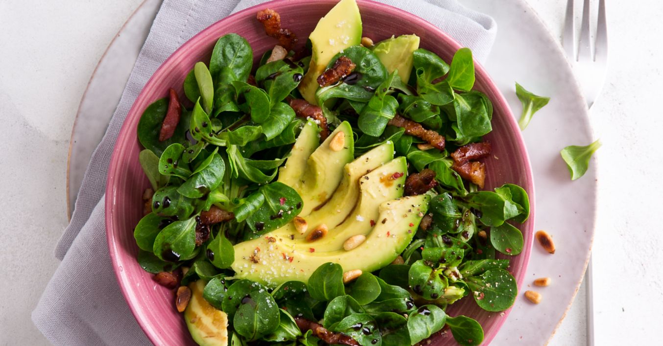 Orzeszki piniowe uprażyć na kolor złotobrązowy na patelni teflonowej, następnie usunąć je z patelni i odstawić na bok. Masło rozgrzać na patelni, pokroić boczek w paski i usmażyć w maśle na krucho. Awokado przeciąć podłużnie na połowę, usunąć pestkę, ostrożnie wyciągnąć łyżką miąższ i pokroić go w plasterki. Umyć roszponkę i porwać na małe kawałki. Plasterki awokado wymieszać z kawałkami roszponki i rozdzielić do dwóch małych miseczek.