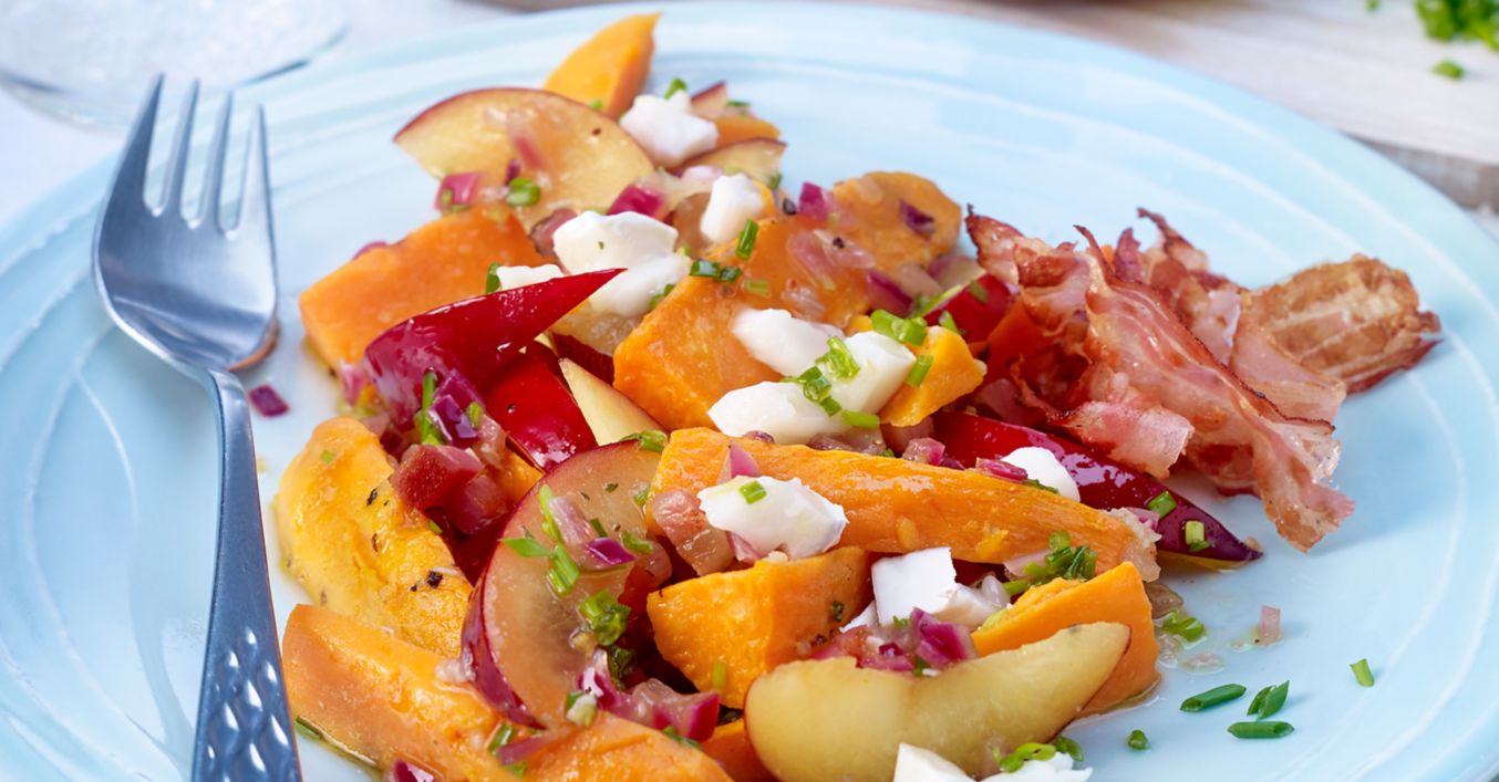 Sałatka z batatami, śliwkami i smażonym boczkiem