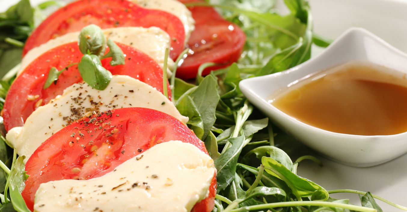 Rukolę rozłożyć na dużym talerzu. Pomidory umyć i pokroić w plasterki, rozłożyć na sałacie. Mozarellę pokroić w plastry, ułożyć pomiędzy pomidorami. Oliwę wymieszać z octem, solą i pieprzem, sosem polać sałatkę. Przed podaniem przybrać kilkoma listami bazylii.