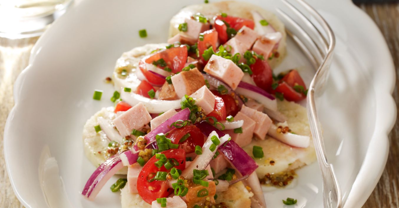Musztardę, ocet i olej wymieszać, przyprawić solą i pieprzem, wymieszać z kiełbasą, cebulą, pomidorkami i szczypiorkiem.