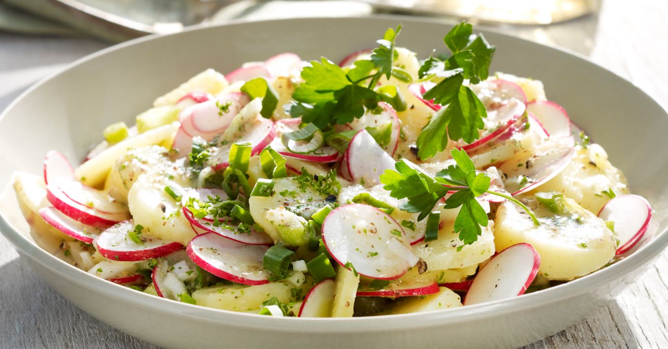 Wymieszać olej, ocet i musztardę , przyprawić solą, pieprzem i cukrem, wymieszać ze szczypiorkiem i pozostałymi składnikami sałatki. Sałatkę ziemniaczaną można ozdobić świeżymi ziołami.