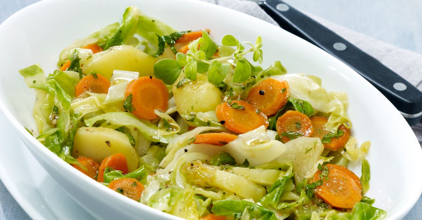 Ziemniaki obrać, pokroić w plasterki i jeszcze gorące wymieszać z marchewką, kapustą i dressingiem. Sałatkę rozłożyć na talerzach, można udekorować świeżym majerankiem i podawać.