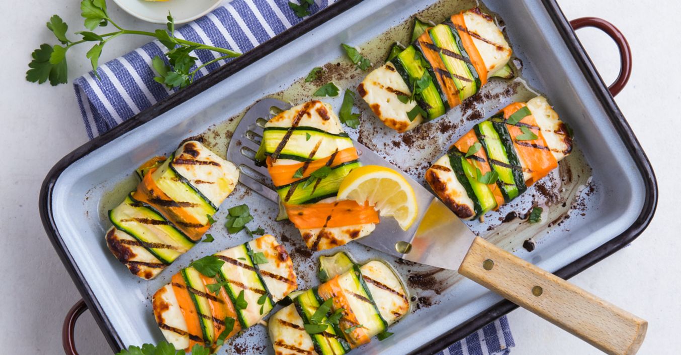 Halloumi pokroić na 10 kawałków. Każdy z nich owinąć plasterkami marchewki i cukinii. Można użyć wykałaczek, by spiąć całość. Grillować przez 3–4 minuty z każdej strony.