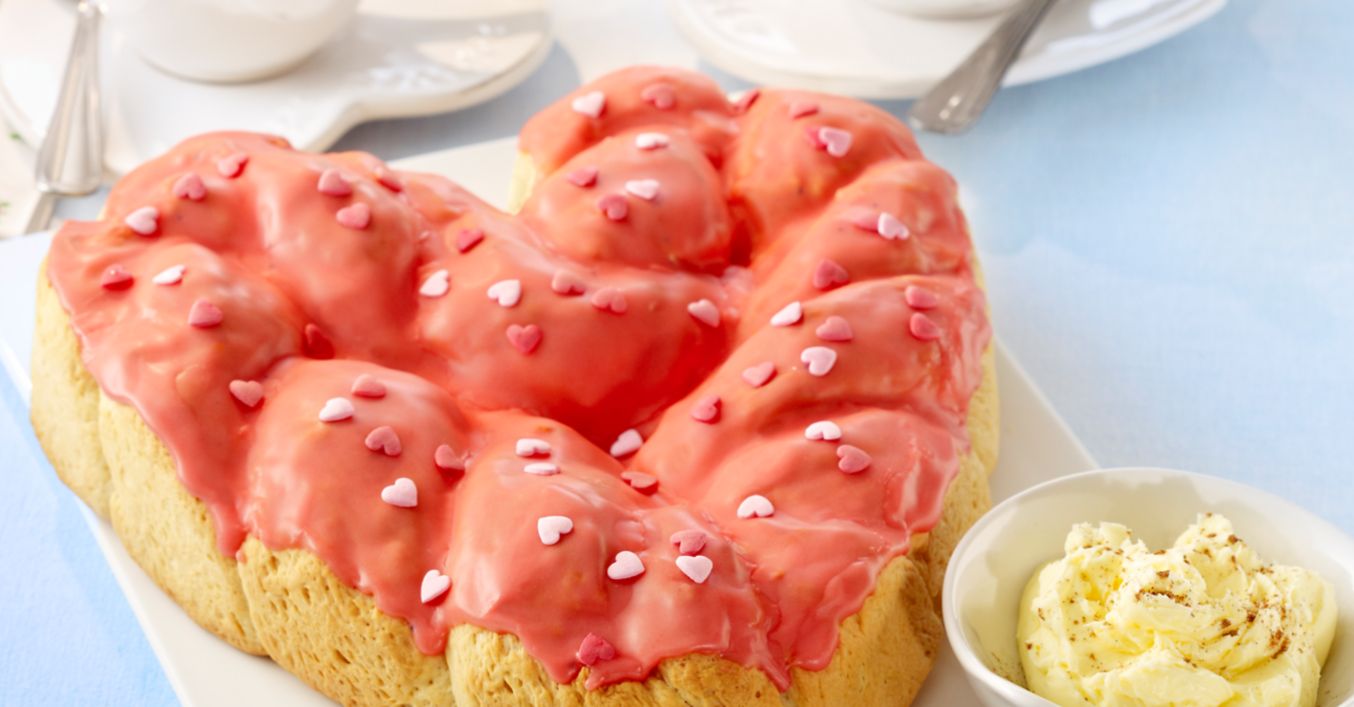 Z ciasta uformować 2 cienkie wałeczki, uformować z nich warkocz, ułożyć go w formie serca na blasze do pieczenia wyłożonej papierem do pieczenia i odstawić do wyrośnięcia na kolejne20 minut. Serce piec w piekarniku rozgrzanym do 180°C (z termoobiegiem 160°C) przez 30-35 minut na kolor złotobrązowy.