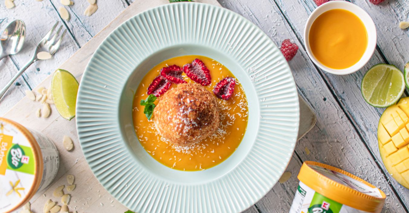 Mango obrać, usunąć pestkę i zmiksować z sokiem z limonki. Olej wlać do połowy rondelka. Z zamrażarki wyciągać po 2 kulki lodów i smażyć na rozgrzanym tłuszczy przez ok. 1 minutę aż wiórki się zrumienią. Usmażone lody przełożyć na talerz, udekorować sosem mango, malinami i listkami mięty.