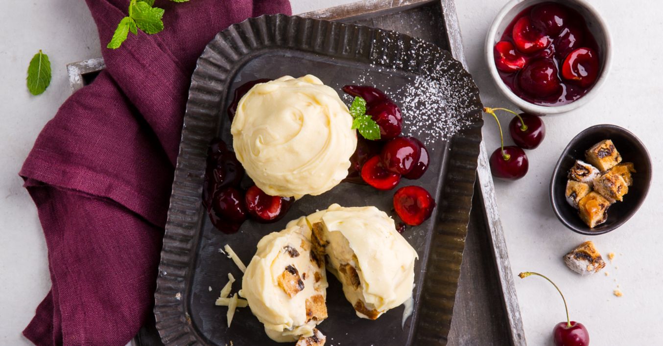 Kule obtoczyć w polewie i podawać z wiśniami, można je również udekorować cukrem pudrem i miętą.