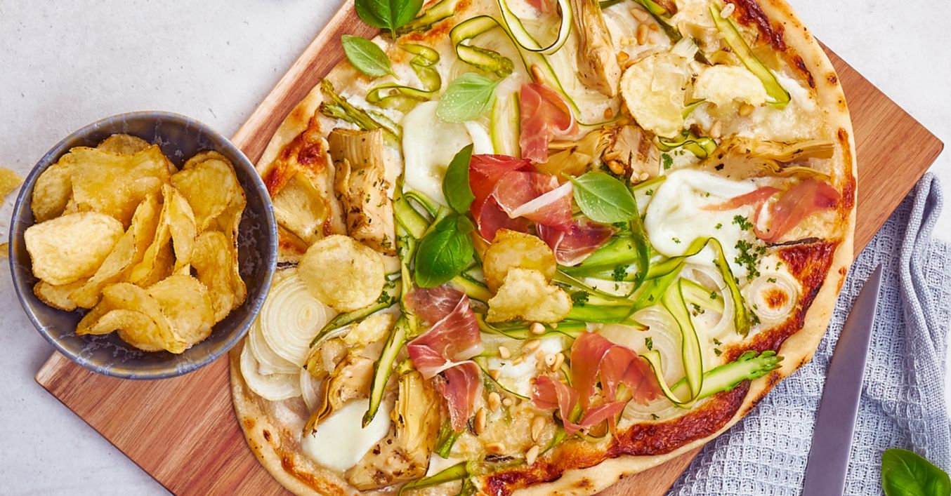 Mąkę przesiać, wymieszać z 1 łyżeczką soli i semoliną, a następnie dodać wodę mineralną i oliwę z oliwek i zagnieść gładkie ciasto. Zawinąć w papier do pieczenia i odstawić w temperaturze pokojowej na 20 minut.Rozdrobnić Gorgonzolę, dodać kwaśną śmietanę, szczyptę soli, pieprzu i skórkę z cytryny, wymieszać, a następnie schłodzić.Cebulę obrać i pokroić w cienkie plastry. Zioła i szparagi umyć i osączyć. Listki ziół posiekać. Dolną 1/3 część długości szparagów obrać, a końcówki odkroić. Szparagi pokroić obieraczką do warzyw na cienkie paski, dodać szczyptę soli i olej czosnkowy i wszystko wymieszać.Mozzarellę i karczochy osączyć, ser pokroić w plastry, a karczochy na mniejsze kawałki. Orzechy pinii uprażyć na patelni przez 3-4 minuty na złotobrązowo.Piekarnik nagrzać do temperatury 220°C w funkcji z grzaniem z góry/z dołu i umieścić blachę do pieczenia na najniższym poziomie. Ciasto podzielić na 4 części, na oprószonej mąką stolnicy rozwałkować 4 cienkie, owalne placki, a następnie przełożyć je na papier do pieczenia. Placki posmarować kremem ze śmietany i Gorgonzoli i ułożyć na nim cebulę, szparagi, karczochy i mozzarellę. Podpłomyki piec przez 10-15 minut na blasze w nagrzanym piekarniku. Plastry szynki Serrano podzielić na mniejsze kawałki, nałożyć na podpłomyki. Podawać udekorowane orzechami pinii, ziołami i chipsami.