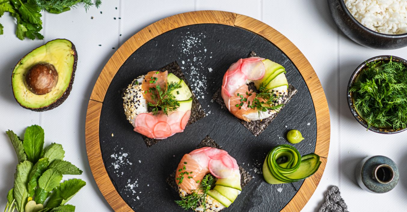 Przygotować dodatki. Rzodkiewkę pokroić na bardzo cienkie plasterki, najlepiej za pomocą „mandoliny”, przełożyć do miseczki, dodać łyżkę octu ryżowego, szczyptę soli, wymieszać i odłożyć. Ogórka szklarniowego pokroić wzdłuż za pomocą obieraczki do warzyw. Plastry przekroić na pół, odłożyć na później. Awokado przekroić na pół, usunąć pestkę, wybrać dojrzały miąższ łyżką, przełożyć do miseczki, doprawić solą, skropić sokiem z limonki i rozgnieść widelcem na pastę. Plastry łososia przeciąć w poprzek na pół.