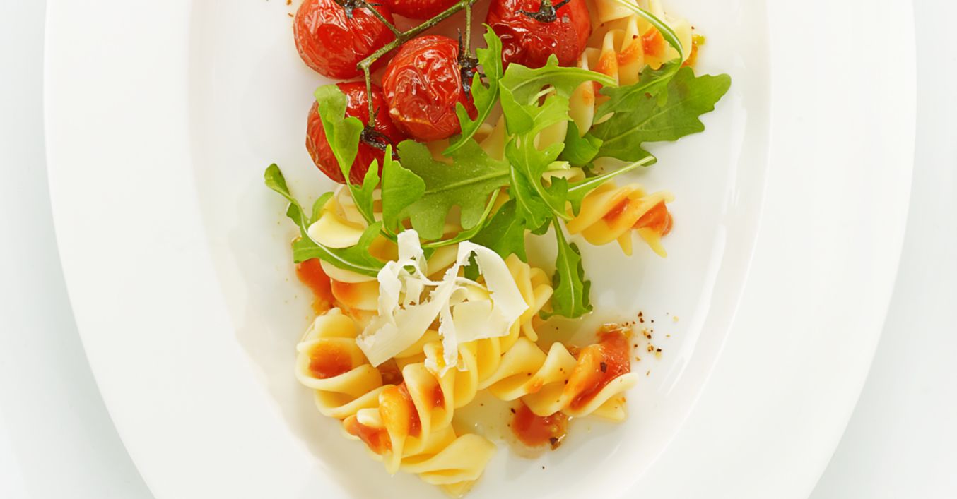 Pomidorki umyć, umieścić w naczyniu do zapiekania, skropić oliwą, przyprawić solą i pieprzem, zapiekać w piekarniku rozgrzanym do 200°C (piekarnik gazowy: stopień 4, termoobieg: 180°C) przez ok. 5-10 minut, aż pomidorki lekko popękają. Rukolę umyć, oczyścić i porwać palcami na małe kawałki.
